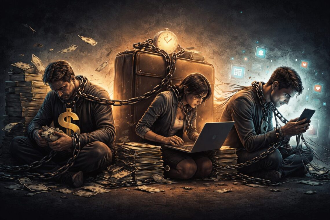 Сондай-ақ саясатқа «байлану, ақшаға, мәнсапқа (карьера), спортқа «құл болу», мәдениет тұтынушысына (кино көргіш, концертке барғыш, коллекция жинағыш, т.б.) айналу – яғни, бүкіл уақытын, қуатын, қаржысын аталған дүниелерге «иелік ету» үшін, сол арқылы өзін «бай» сезіну үшін сарп етуі. Өзін тануға, өзін дамытуға, мәнді-мағыналы дүниеге жұмсауға уақыт, ақша, күш-қуат (энергия) таба алмай қалуы; отбасы құндылықтарының төмендеуі, ақыр соңында түксіз қалуы: іште – бостық, санада – сапырылыс, бойдан қуат, жүректен намыс-жігер жоғалады. Қуыскеуде дерті күшейеді…