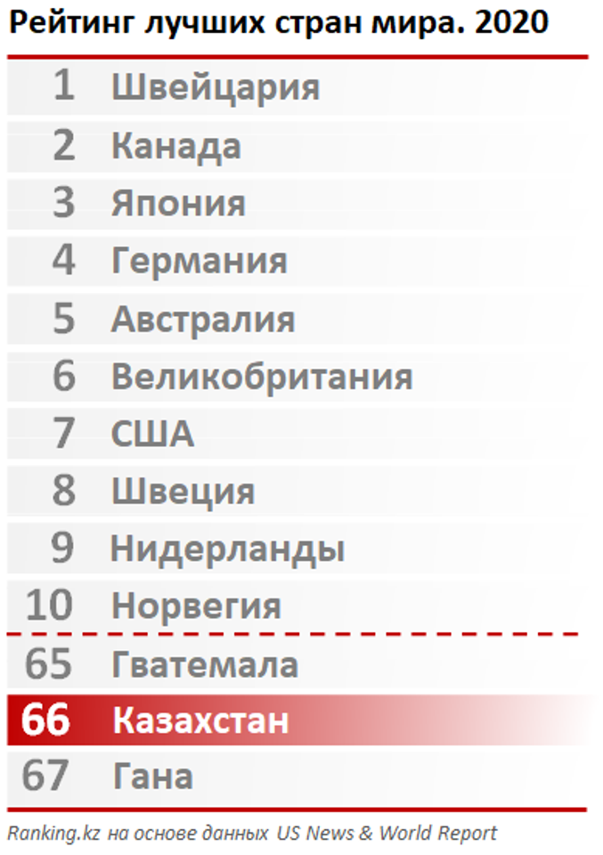 Казахстан, в свою очередь, поднялся на две строчки и занял лишь 66-е место, расположившись между Гватемалой (65-е место) и Ганой (67-е место). Кроме того, Казахстан уступил России (23-е место) и Азербайджану (61-е место).