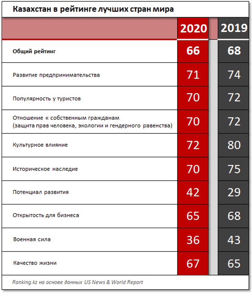 Казахстан улучшил свое положение по 7 из 9 показателей, хотя это улучшение не столь значительно. Лучшие позиции страна имеет по следующим показателям: военная сила (36-е место), потенциал развития (42-е место) и открытость для бизнеса (65-е место).