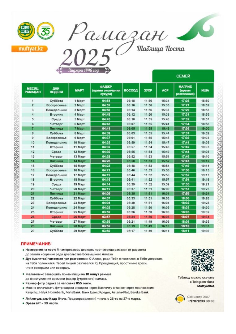 В 2025 году месяц Рамадан начнётся 1 марта и закончится 29 марта. Расписание дано по областным центрам Казахстана.
