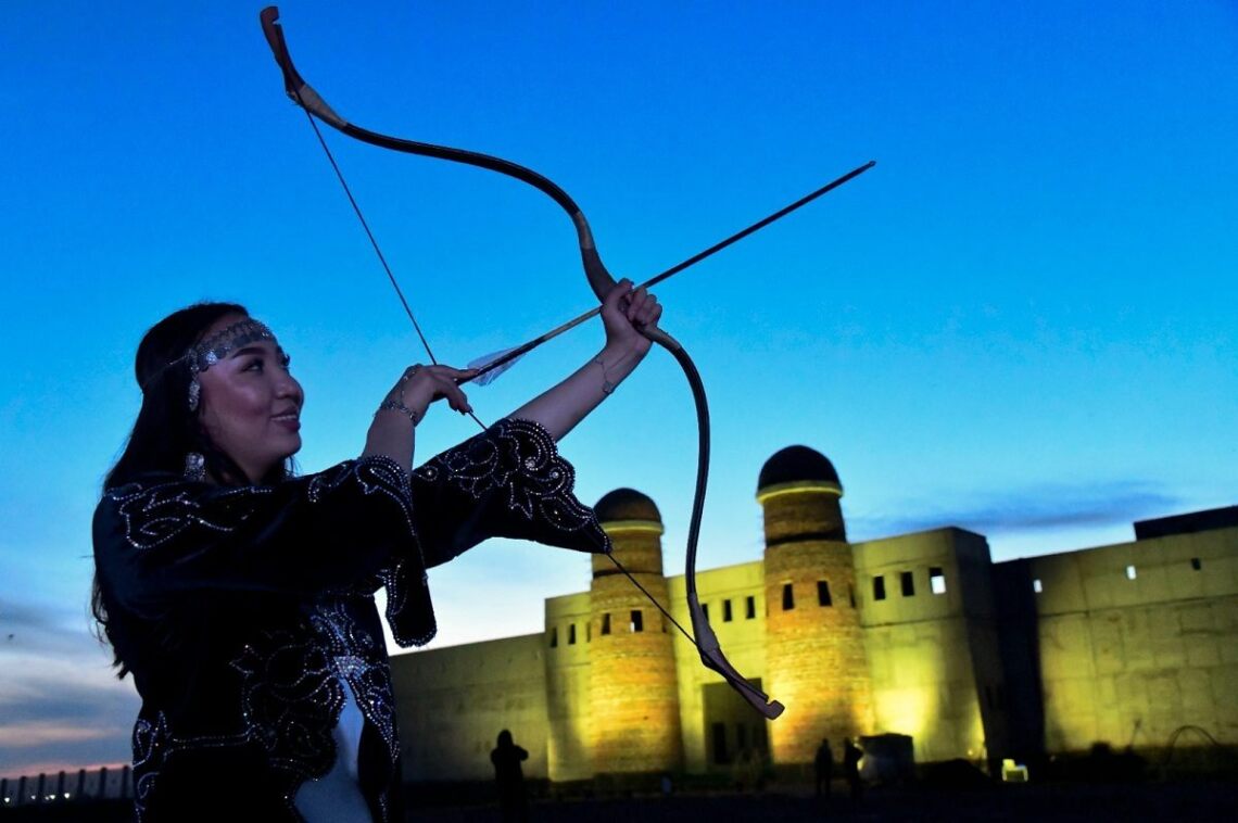 На фоне Южного входного портала «Арка», символизирующего направления караванных путей, уходящих в глубь степных просторов Сарыарки, освещённого лучами прожекторов, была создана особая атмосфера погружения в историческое прошлое.