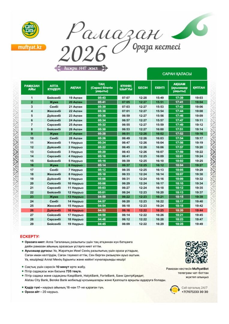 Предлагаем вашему вниманию расписание времени поста и намаза на священный месяц Рамадан для городов Карагандинской области (2026). Напомним о важных пунктах в преддверии Рамадана: