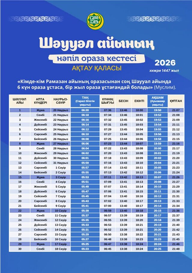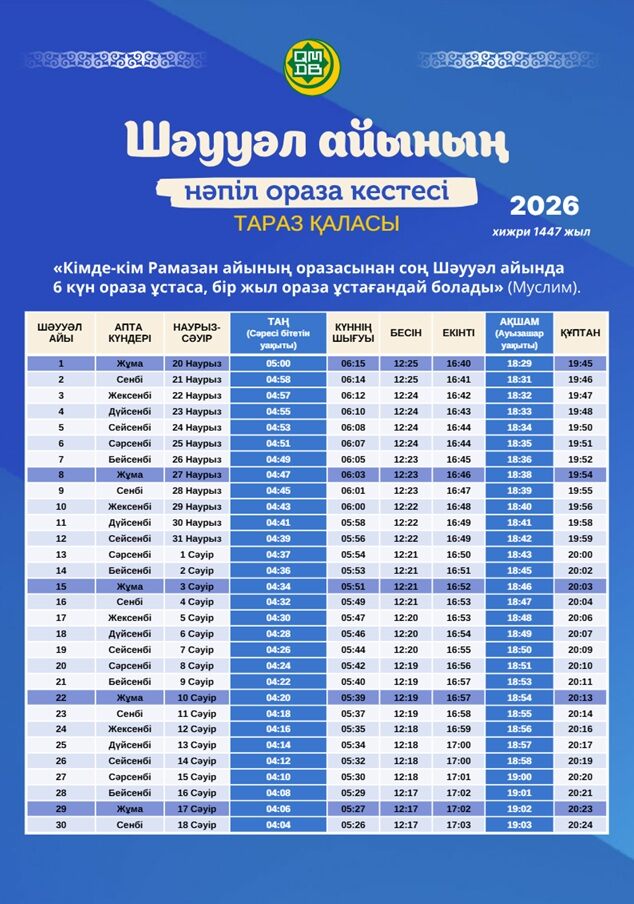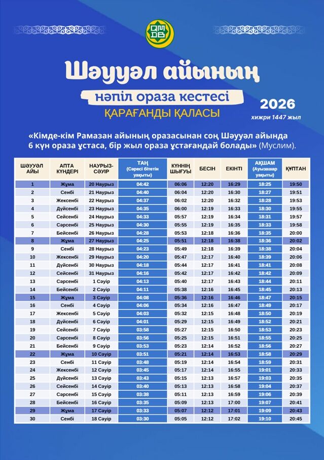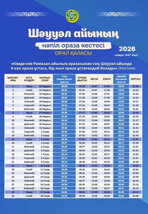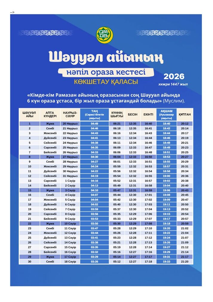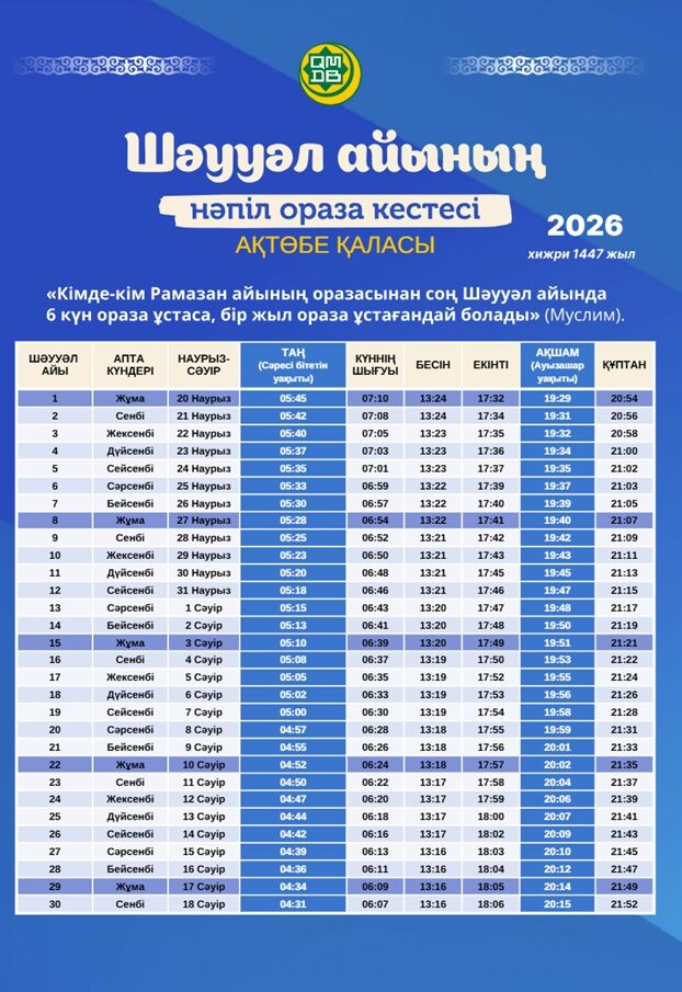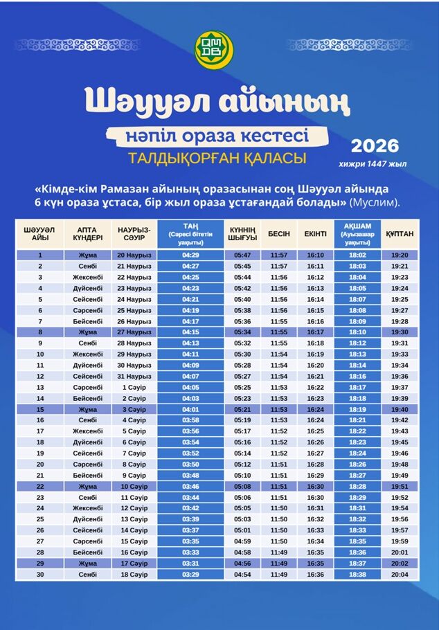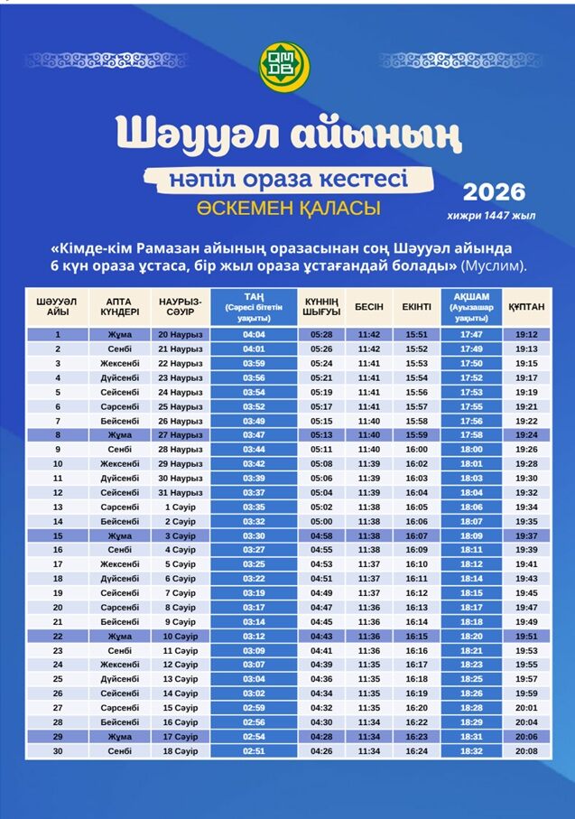 Предлагаем вашему вниманию расписание времени поста и намаза на месяц Шавваль для городов Казахстана (2026).