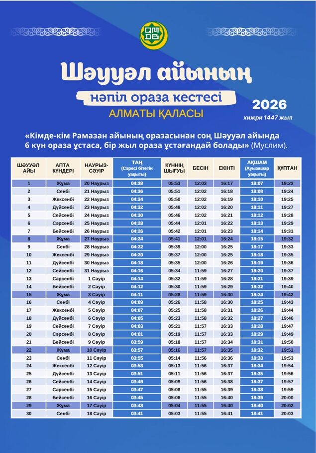 Предлагаем вашему вниманию расписание времени поста и намаза на месяц Шавваль для города Алматы (2026).