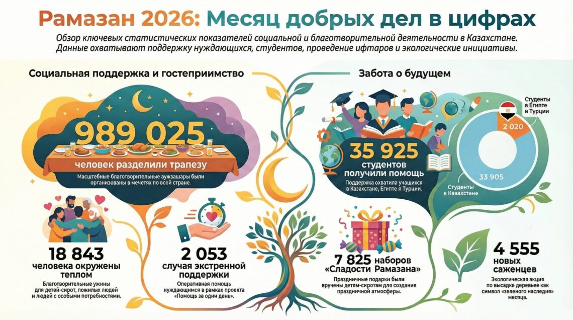 В священный месяц Рамазан 2026 года фонд «Зекет и благотворительность» при Духовном управлении мусульман Казахстана (ДУМК) реализовал масштабные благотворительные мероприятия по всей республике.